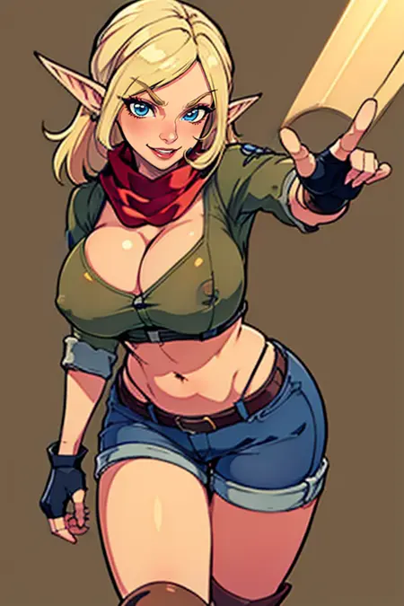 green cropped shirt, denim shorts, midriff ,fingerless gloves, boots,