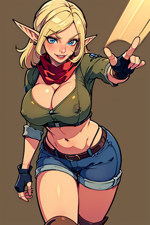 绿色短款上衣,牛仔短裤,露脐装,无指手套,靴子