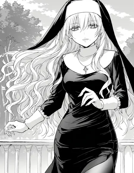 女修道士(モノクローム)- 十字架のネックレス、女修道士、修道服、ヴェール、コイフ、ドレス、長袖、フリル袖、サイドスリット、タイツ