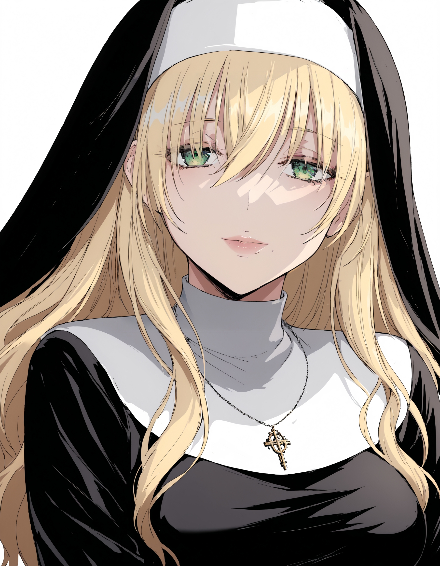 女修道士(カラー)- 十字架のネックレス、女修道士、修道服、黒いヴェール、白いコイフ、黒いドレス、長袖、フリル袖、サイドスリット、黒いタイツ