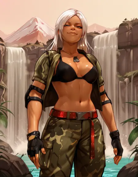狗牌、肘部护具、敞开的迷彩夹克、露腹、迷彩长裤、战斗靴、黑色胸罩、无指手套、胸部显露、袖子卷起、红色腰带