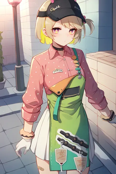 - white gloves, white skirt, pleated_skirt, black hat, long sleeves, green apron, black headwear, pink shirt, polka dot, bandaid on leg, black footwear, white socks, loose socks, bracelet,