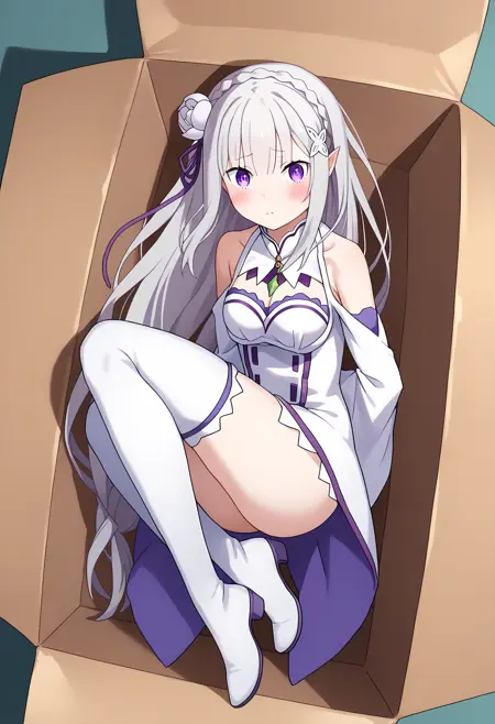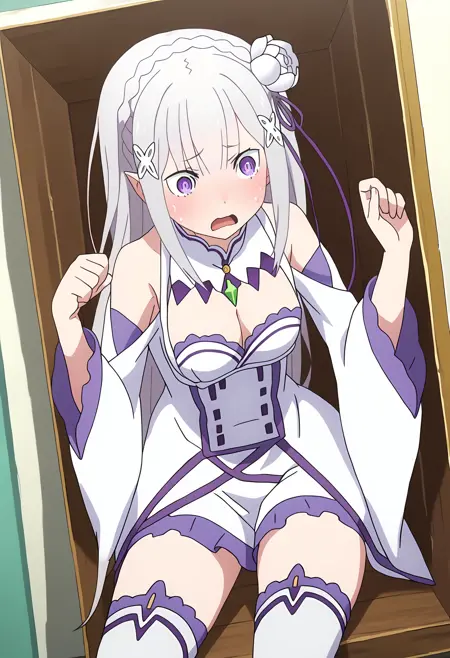 shiclaustro, ビューワーを見つめる、赤面、口を閉じた、座っている、全身、横から、腕を上げた、無表情、足を上げた、膝を曲げた、手で自分の頭を押さえている、閉じ込められている、容器の中、狭い、拘束されている、立ち往生している、