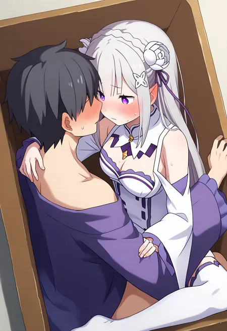 shimultiplestro、赤面、口を開けた、2人の女の子、汗、横たわっている、靴下、他者を見つめる、汗滴、ユリ、波打つ口、上の女の子、箱、視線の交差、容器の中、固体の楕円形の目、狭い、立ち往生している、