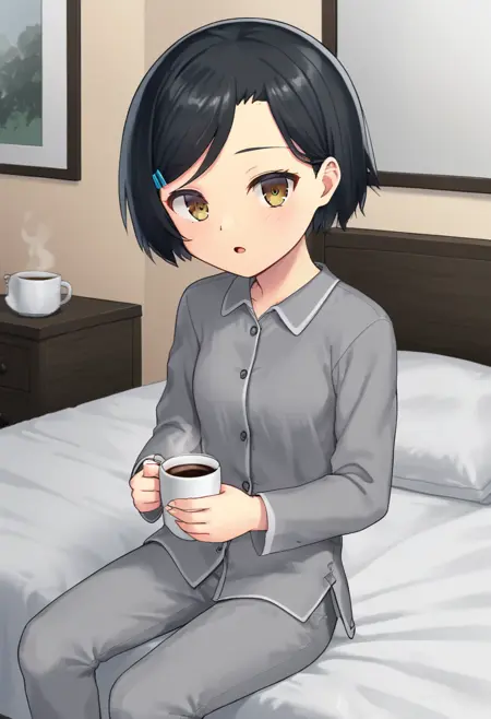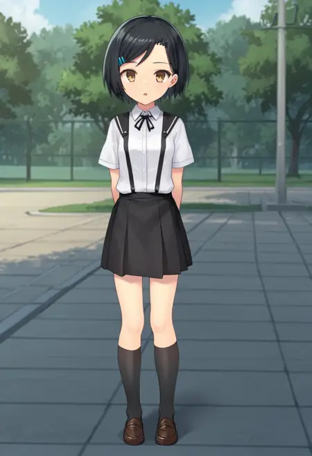 校服:yumesakiminakaren,黑发,短发,发夹,棕眼,粉色手镯,白衬衫,短袖,黑裙,背带裙,及膝袜,乐福鞋