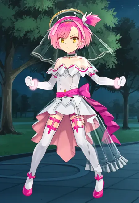 魔法少女形态:yumesakiminakaren,粉发,短发,一侧向上,项圈,发饰,面纱,光环,白裙,无肩带裙,肘部手套,粉色手镯,大腿袜,魔法少女