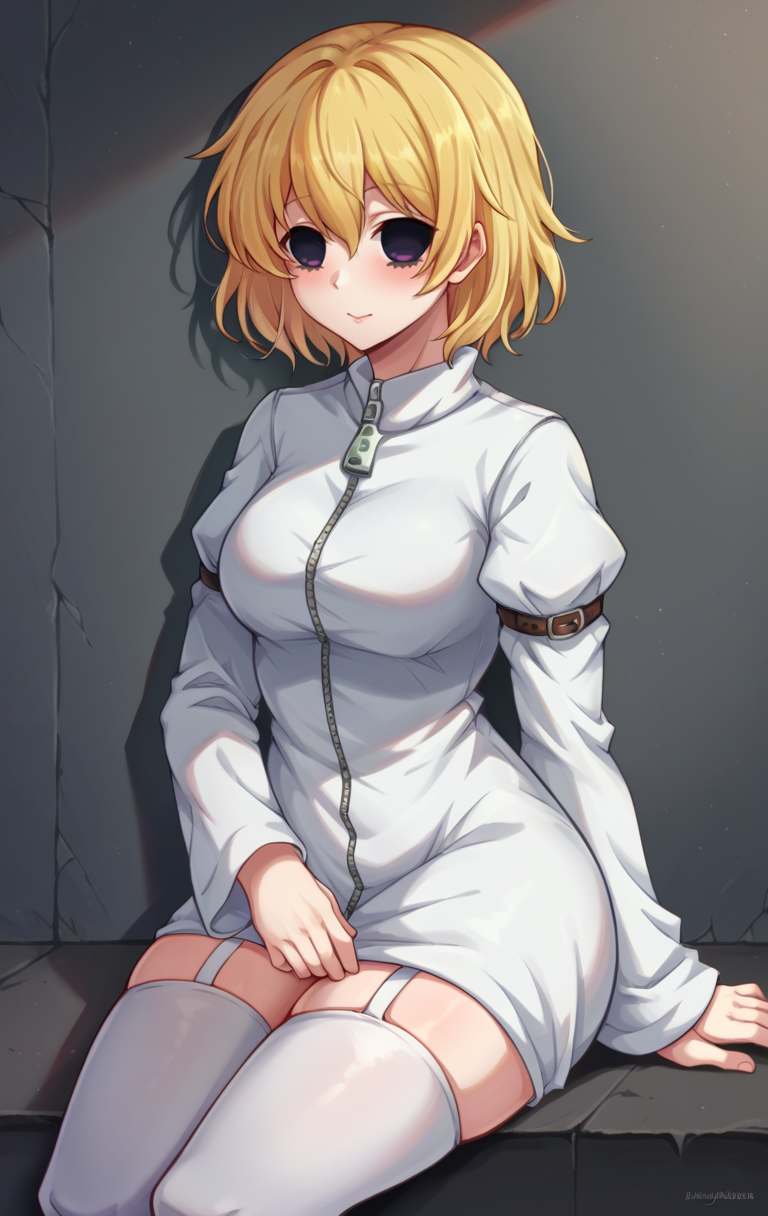 JudgeAngelsSDXL,1girl,solo,((((black eyes))),((((no pupils)))),((((completely black eyes)))),glowing eyes,short hair,zipper,blonde hair,thighhighs,white dress,white thighhighs,garter straps