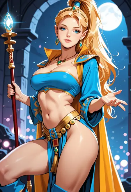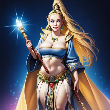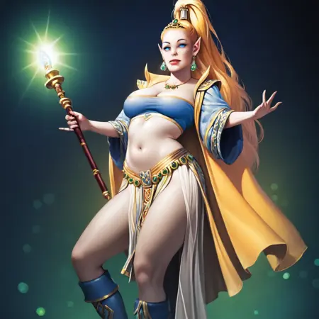 FirionaVieEQ, 1girl, ソロ, エルフ, 非常に長い髪, 金髪, 高いポニーテール, 青い目, 唇, ピアス, 尖った耳, 冠, ジュエリー, ネックレス, 大きい胸, 胸元, 黄色いマント, 青いキャミソール, へその下, 腹部, 股間, 広い袖, 広い服, 青い腰布, 骨盤カーテン, ベルト, ブレスレット, 太い太もも, 高いヒール, 青い膝丈ブーツ, 魔法の杖,