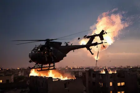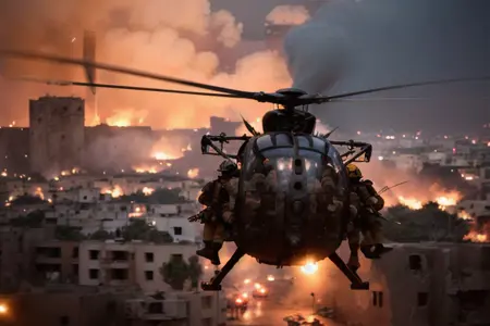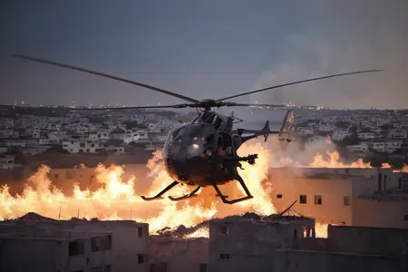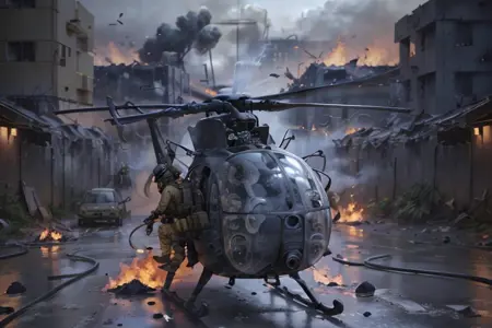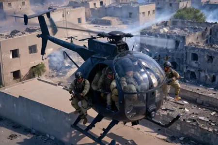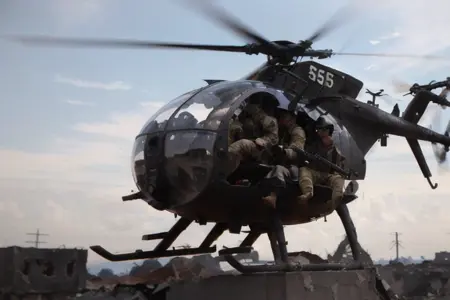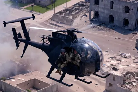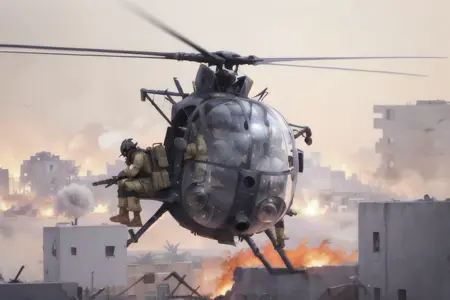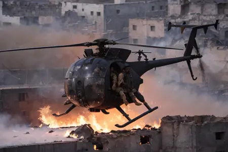 Hanging out over the street on their low, fast approach, they scanned the people below, their upturned startled faces, their hands, their demeanor, trying to read what would happen when they hit the street. As the Little Birds came in, the crowd spooked. People and cars began to scatter. Wind from the powerful rotors knocked some people down and tore the colorful robes off some of the women. A few of the Rangers, still high overhead, spotted people below gesturing up at them eagerly, as if inviting them to come down to the streets and fight.