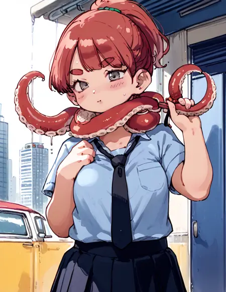 description: 1girl, black necktie, dark blue skirt, light blue shirt, thick eyebrows, short sleeves, red hair, ponytail, tentacle hair, tentacles, octopus, school uniform, grey eyes,