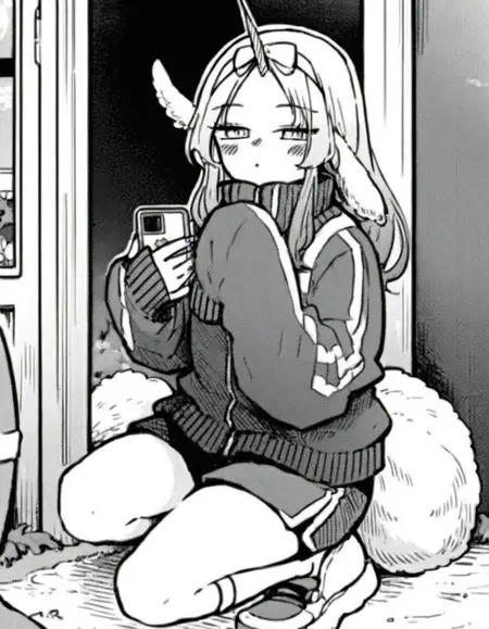 説明(モノクロ): 1girl, solo, ショートパンツ, 携帯電話, 角, 尾, 単一の角, 携帯電話, ジャケット, 靴, 携帯電話を持っている, 袖が手首より長い, チーク, スマートフォン, 長い髪, リボン, 持っている, トラックジャケット, 動物の耳, もふもふした尾, グレースケール, モノクロ
