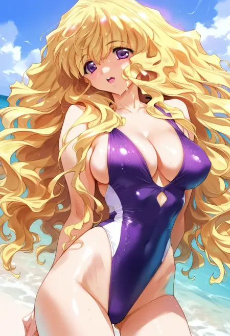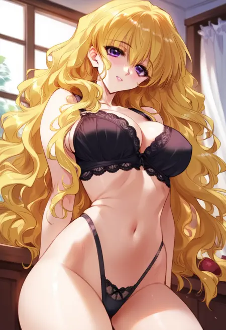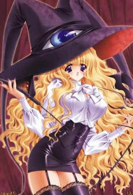 트리거: lilith_yami, 금발 여성, 보라색 눈, 큰 가슴, 물결 모양 머리카락, 마녀 모자, 고정스트랩, 허벅지 긴 양말, 치마
