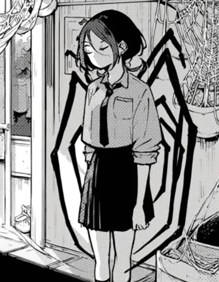 描述(单色): 1girl, solo, 胸袋, 裙子, 闭眼, 口袋, 衬衫, 袜子, 鞋子, 短发, 衬衫塞进裙子里, 百褶裙, 裙子, 校服, 有领衬衫, 蜘蛛腿, 触角, 多色头发, 灰度, 单色
