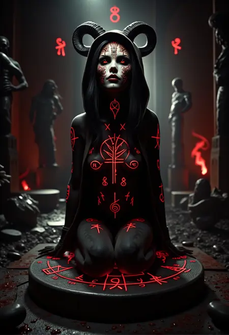此LoRA会为生物赋予皮革般的恶魔皮肤,并装饰以符文和铭文。如需,环境也可以搭配相同的符文进行装饰。