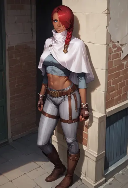 服装——白色短披风、灰色露脐上衣、腰部、腰带、灰色长裤、无指手套、靴子,