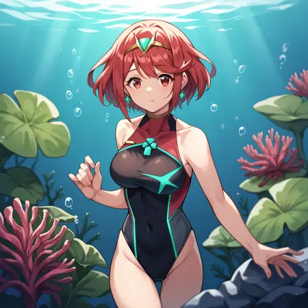 Pro Swimmer : pyraproswim, red hair, short hair, red eyes, earrings, tiara, two-tone swimsuit, chest jewel, competition swimsuit,