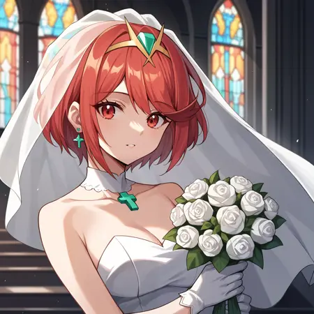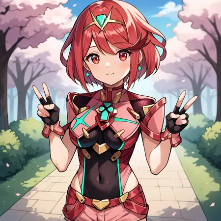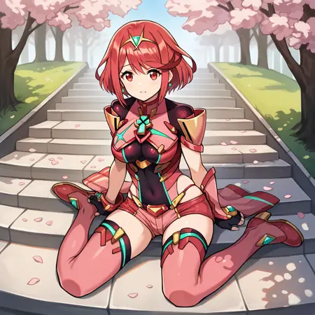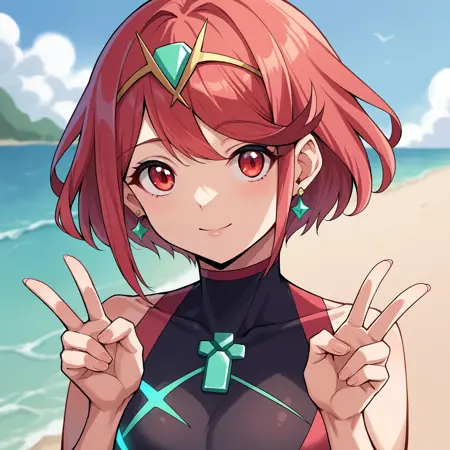 Default : pyradef, red hair, short hair, red eyes, earrings, tiara, fingerless gloves, chest jewel, covered navel, red shorts, short shorts, impossible clothes, armor, red thighhighs,
