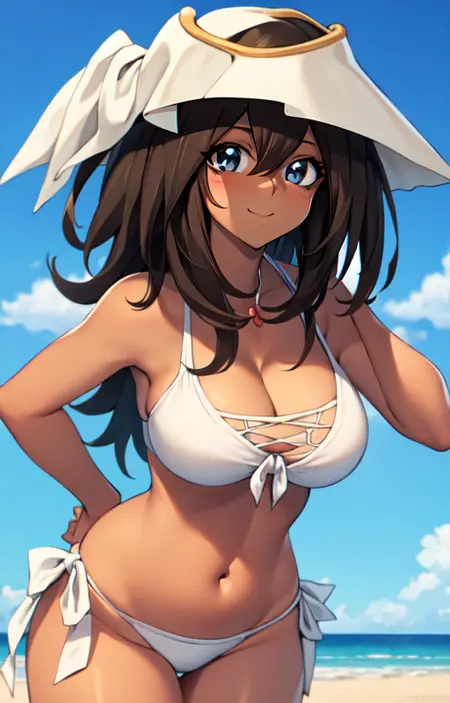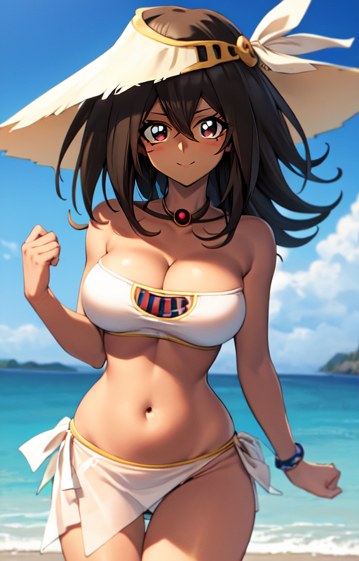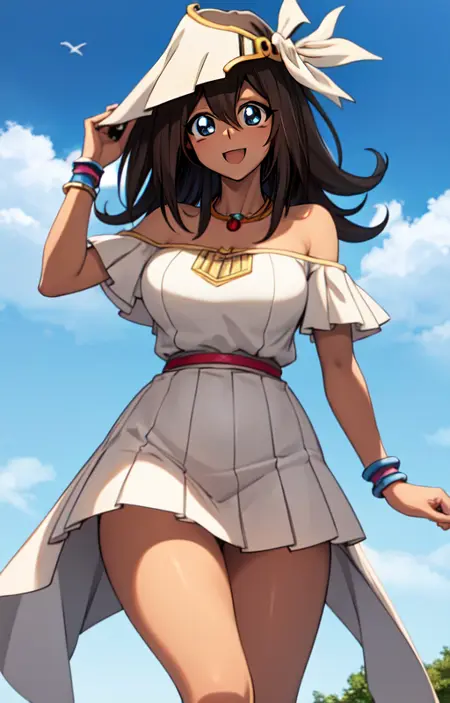 For her outfit use: egyptian, egyptian clothes, eye of horus, anklet, armlet, skirt, white dress, white hat, and off-shoulder. For different outfits place these in the negative prompt.