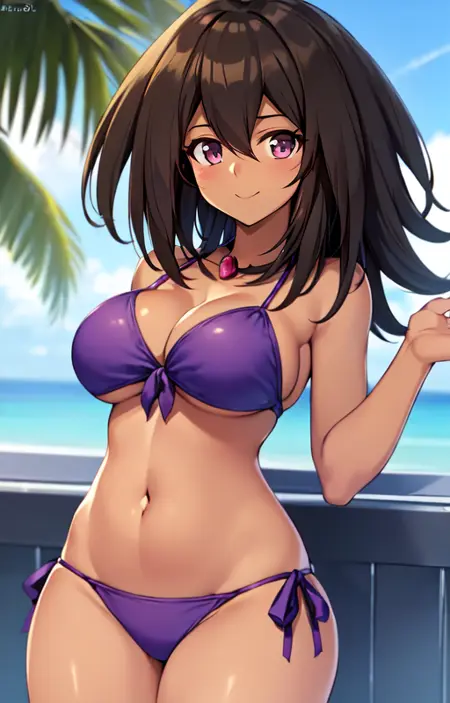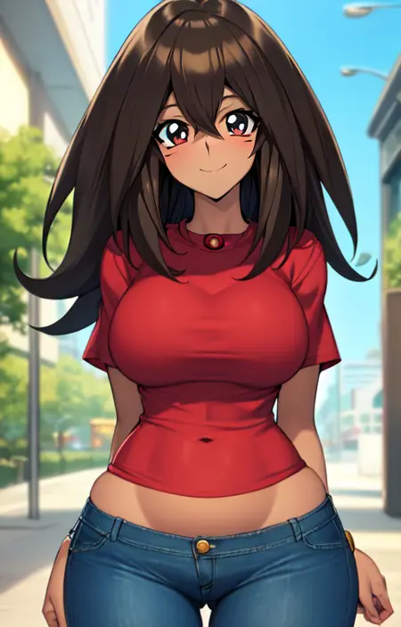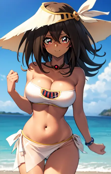 Activation tag: mana_yugioh; use along with (long hair:0.8), medium hair, brown hair, dark skin, dark-skinned female, green eyes, and large breasts. Also, place wizard hat, blue headwear, and blonde hair in the negative prompt.