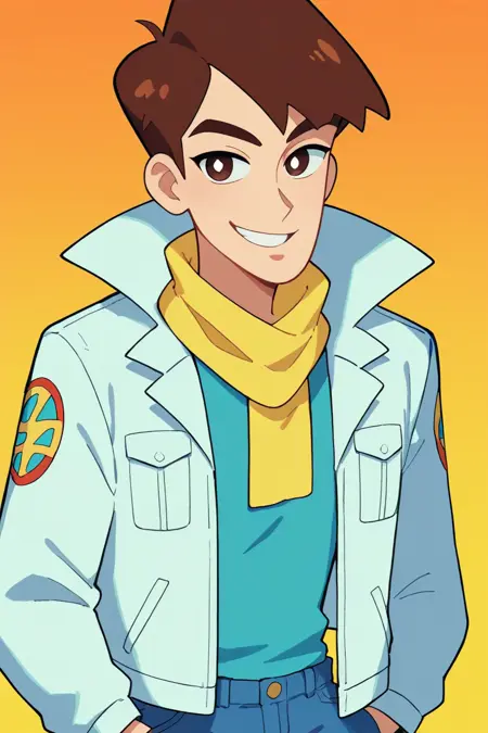 프롬프트: 고타로 고, 1소년, 혼자, 갈색 머리, 어두운 눈, 흰색 재킷, 노란 스카프, 파란 셔츠, 청바지