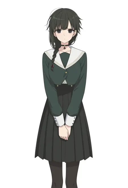 black choker,black skirt,white sailor collar,black pantyhose,pleated skirt,green shirt,