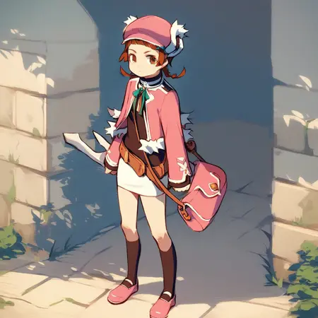 提示词: Rifmonic_scs,出租车帽,耳罩帽,粉红色帽子,双马尾,刘海,齐刘海,鬓发,棕色头发,粉红色夹克,敞开式夹克,毛皮镶边夹克,长袖,领巾,黑色上衣,腰带,裙子,白色裙子,背包,刀鞘,背后武器,黑色袜子,过膝袜,粉红色鞋子