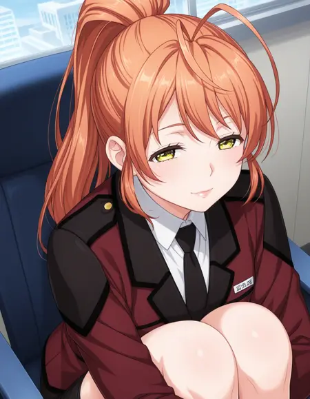 military uniform, red clothing, black necktie, pencil skirt, side slit