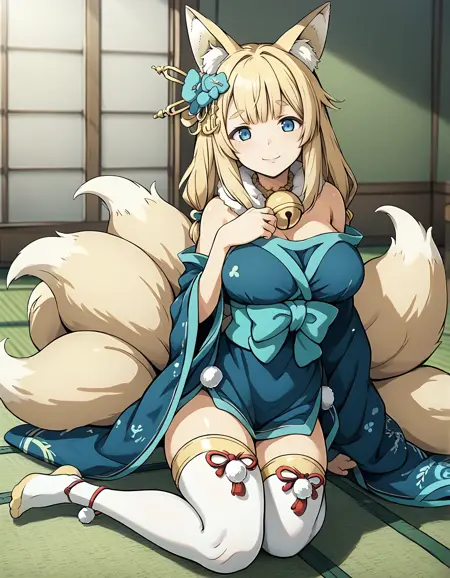 Recommended Prompts: 1girl, animal ears,bangs, blonde hair, multiple tails, hair ornament, bell, blue eyes, kimono, fur collar,bare shoulders,thighhighs