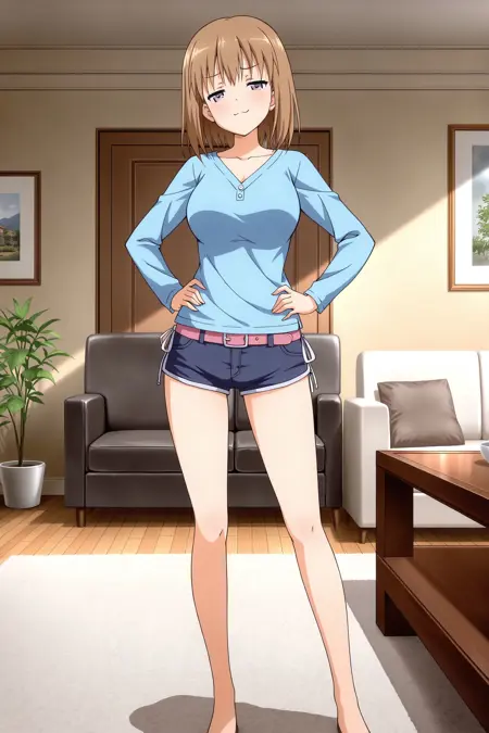 (青シャツ、Vネック、ボタン、長袖、ピンクのベルト、ショートパンツ、サイドリボン付きショートパンツ、素足、)