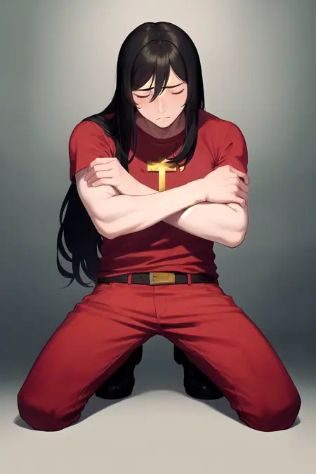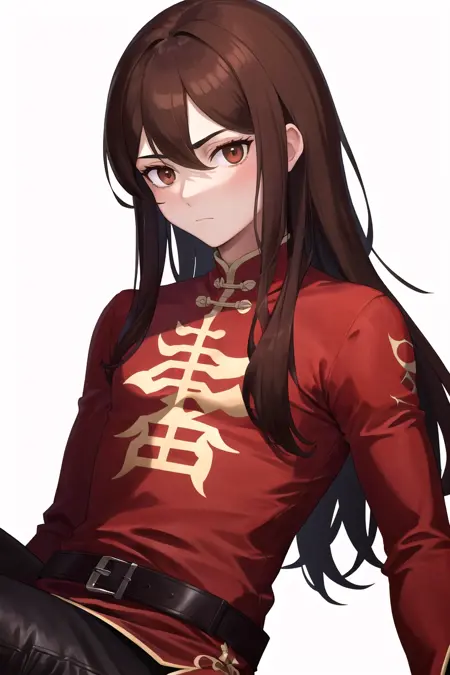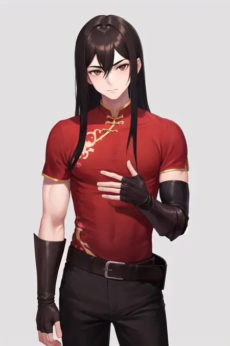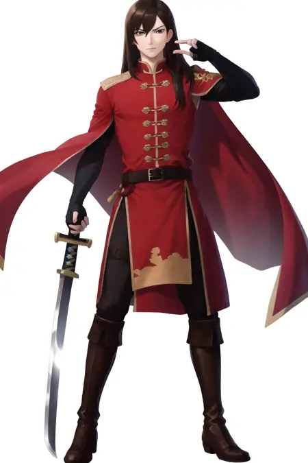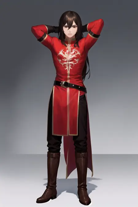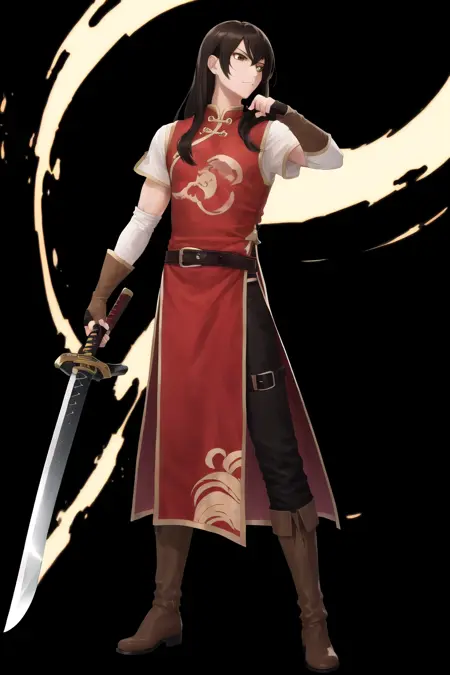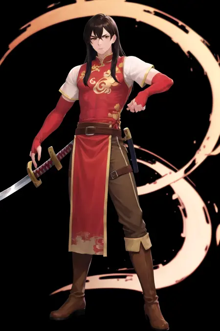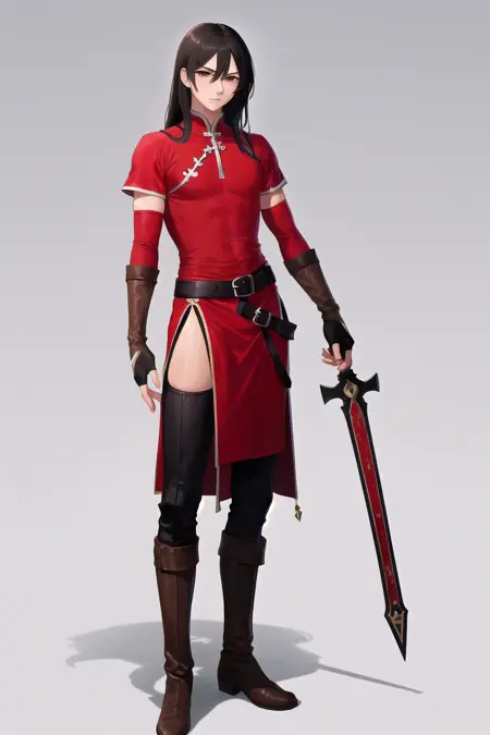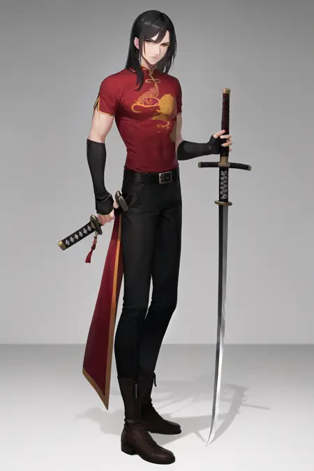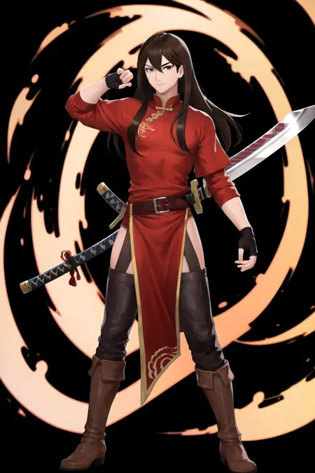 长发,靴子,腰带,侧开衩,长裤,黑色腿部服饰,中式服饰,红色衬衫,长袖,刀鞘,武士刀,棕色鞋履,护肘手套,无指手套