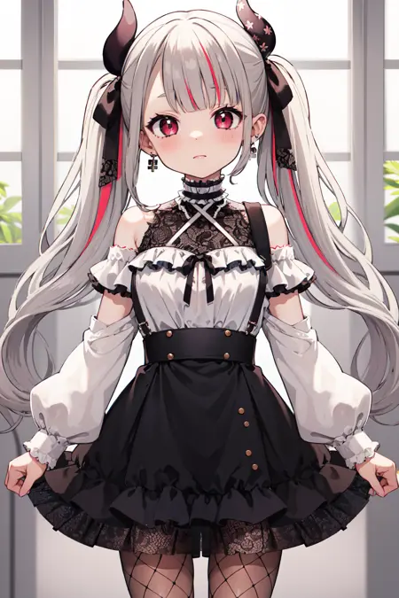 outfit2hmnab, 彩色头发, 发带, 双马尾, 白色衬衫, 黑色裙子, 鱼网袜, 背带裙, 露肩, 耳环, 蓬松袖子