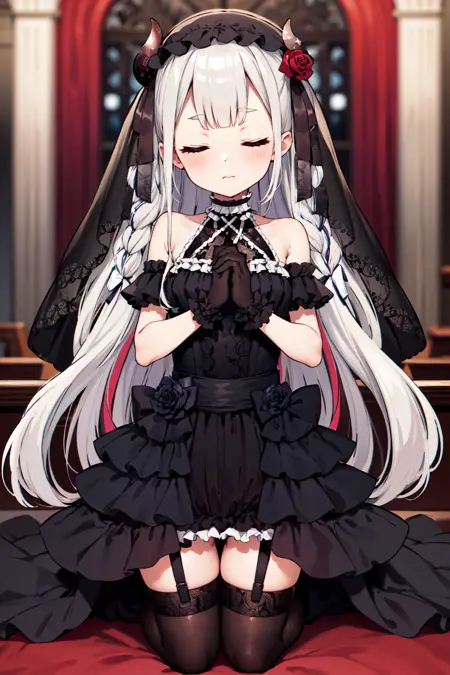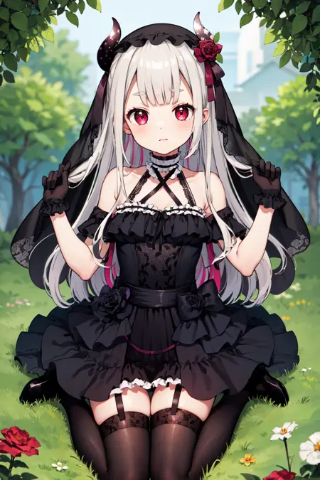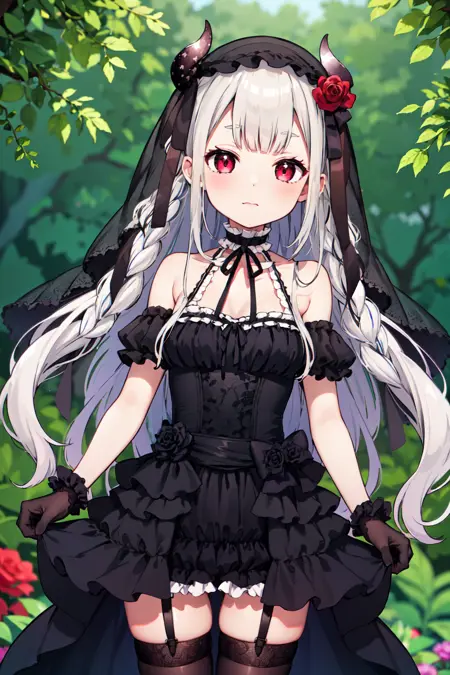 outfit4hmnad, 面纱, 袜带, 黑色连衣裙, 黑色及膝袜, 黑色手套, 发带, 洛丽塔风格, 交叉背心, 露肩, 花边, 玫瑰, 丝带, 彩色头发