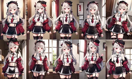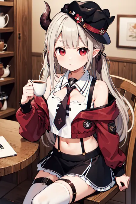 outfit3hmnac, 角, 帽子, 腹部露出, 白色衬衫, 改短上衣, 落肩, 黑领结, 长袖, 无袖, 黑色裙子, 黑色及膝袜, 大腿绑带, 红色夹克, 背带