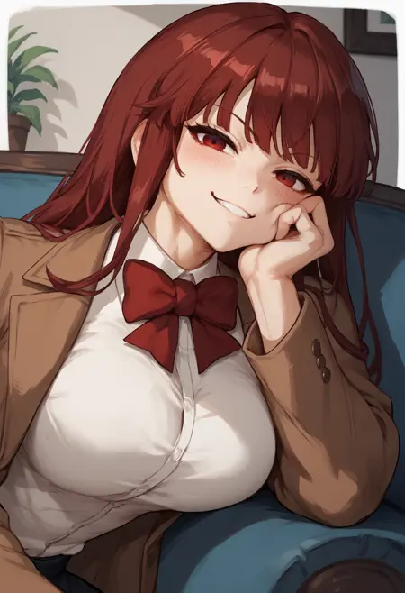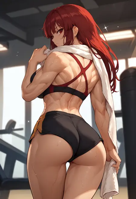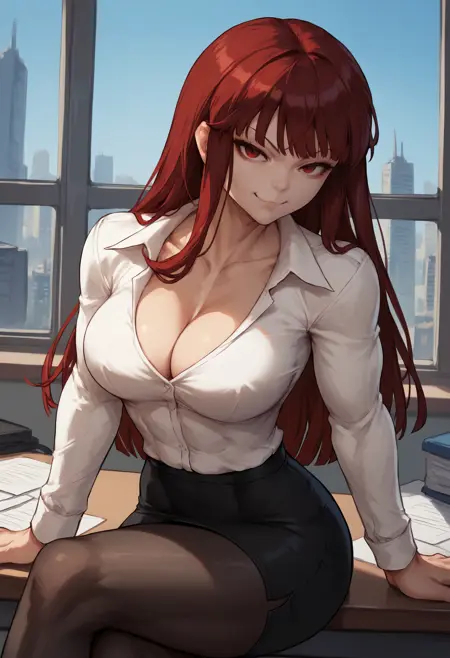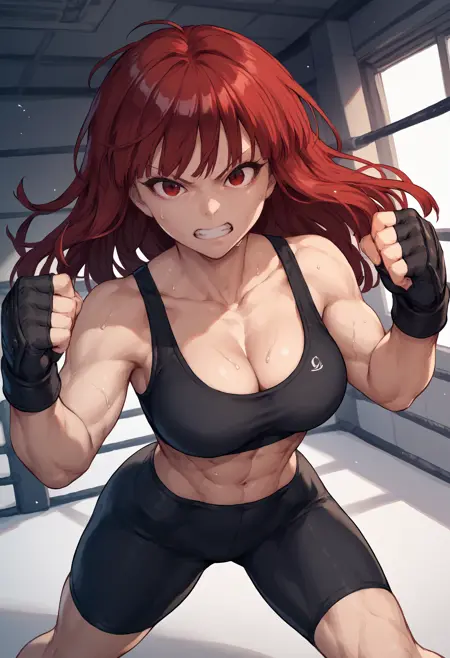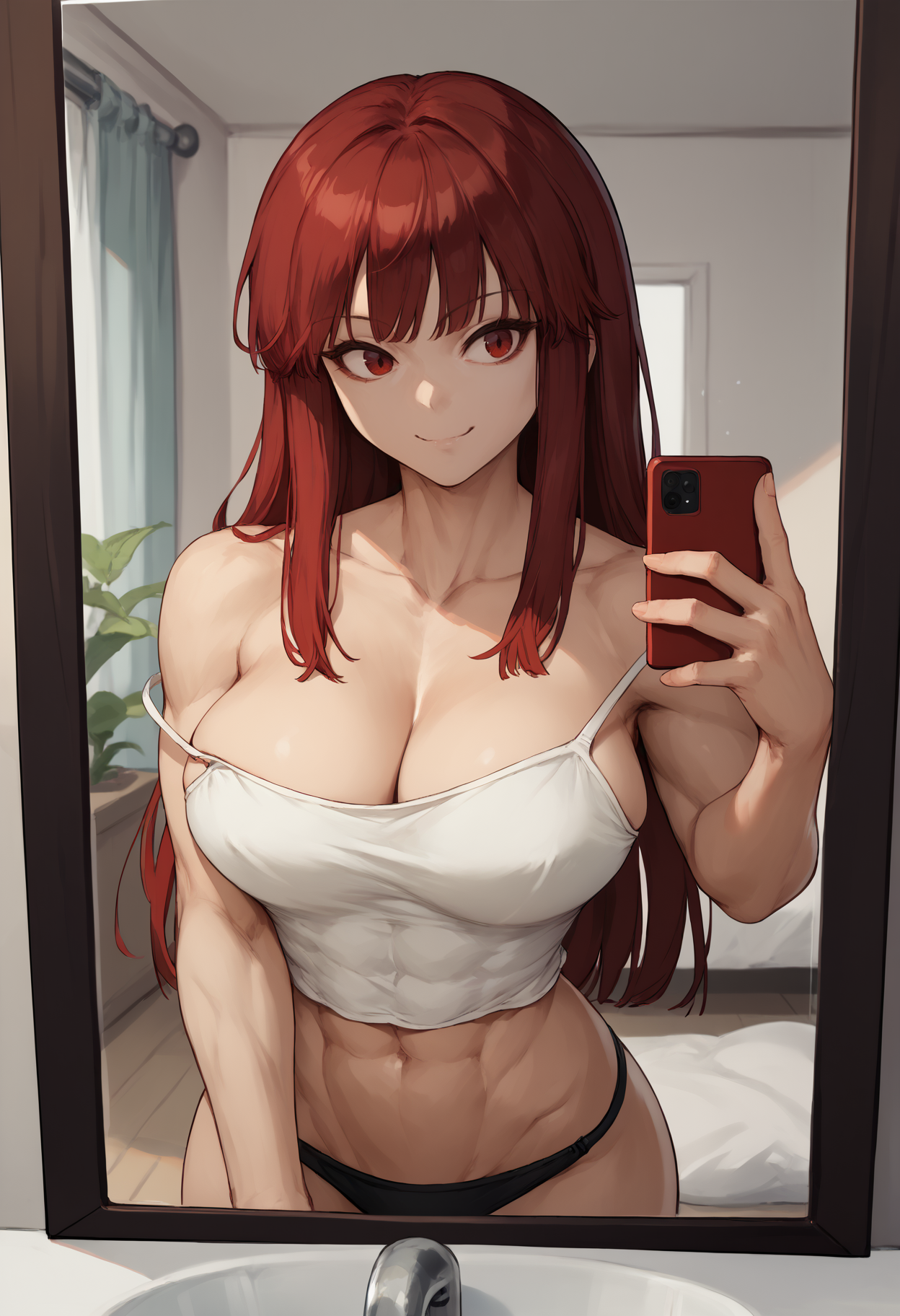 "sakurananten, red eyes, red hair, fringe, long hair, large breasts, toned"