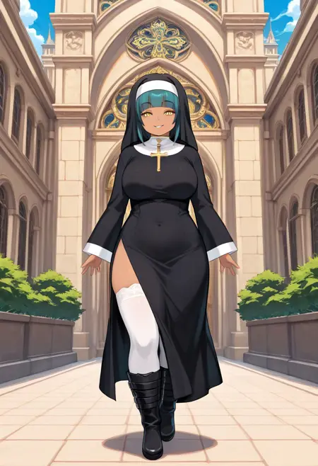 복장: 수녀복, 수녀, 허벅지까지 오는 양말, 부츠, 십자가, 검은 드레스