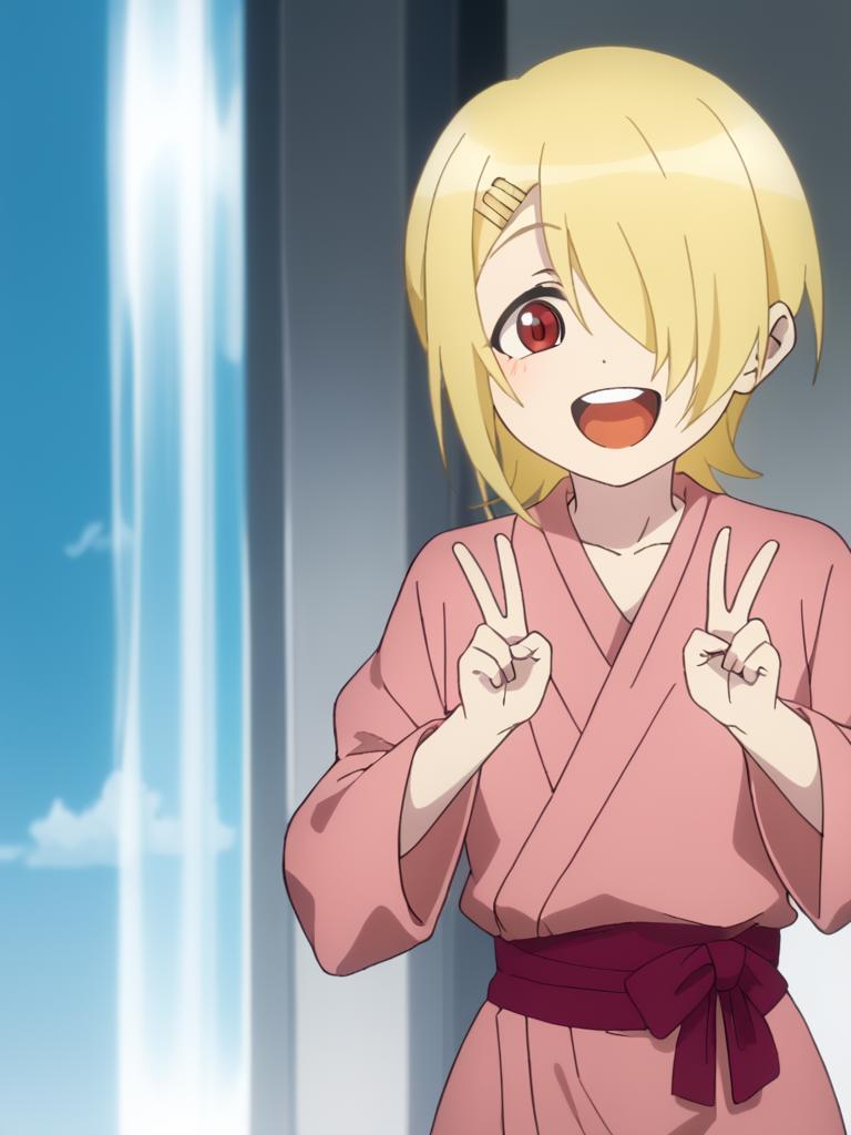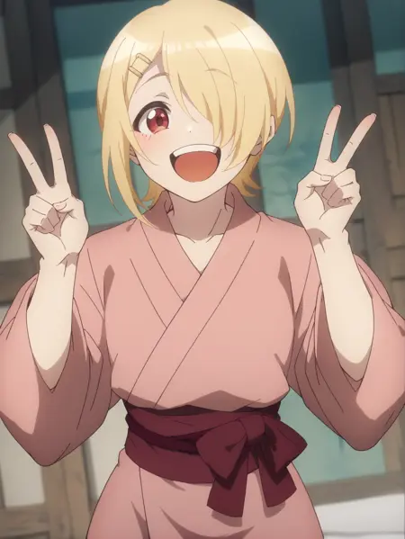 aku-s2, hairclip, hair ornament, pink kimono, red sash