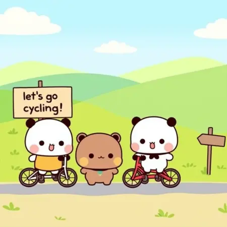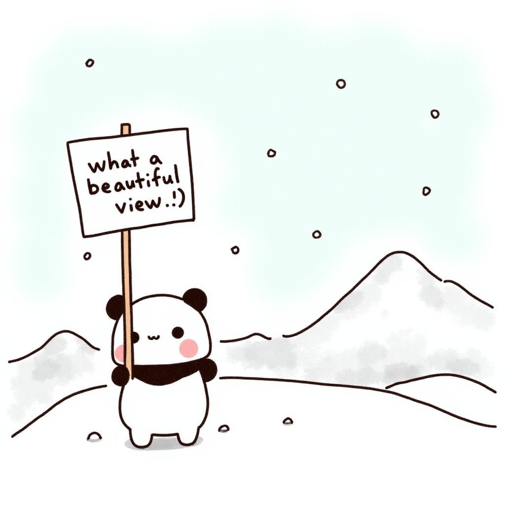 "bubu_dudu 팬더와 곰의 손으로 그린 일러스트, 따뜻한 산속 오두막 안에서 'che bello il relax'라고 쓰인 표지를 들고, 타오르는 벽난로 옆에 서 있는"_