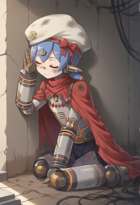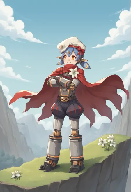 humanoid robot, robot joints, robot ears, mechanical hair, blue hair, orange eyes, low twintails, hair ornament, mechanical arms, mechanical legs, beret, cape, flower, bloomers, bandaid on nose