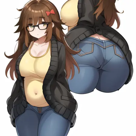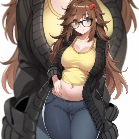 For her normal outfit: black cardigan, cardigan, yellow tank top, jeans