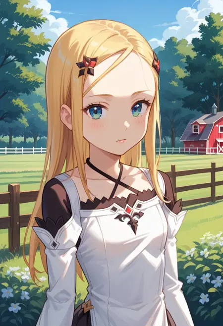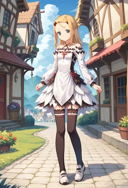提示词: Murno_SCS,金发,长发,发饰,额头,吊带装,白色连衣裙,分离式袖子,层叠袖子,长袖,黑色裙子,白色吊袜带,吊袜带,黑色过膝袜,过膝袜,鞋子,白色鞋子,