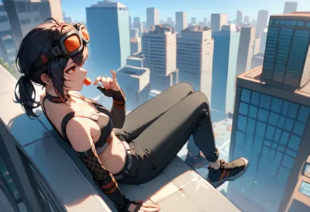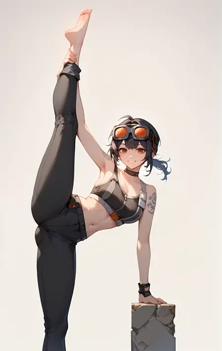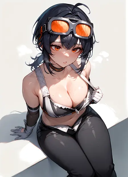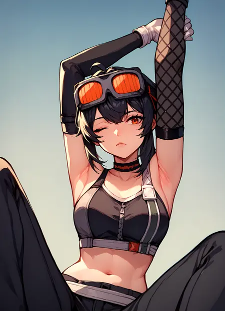 grace howard, goggles on head, choker, shoulder tattoo, elbow gloves, belt, black pants, black shoes