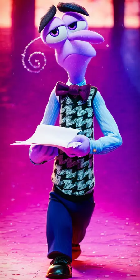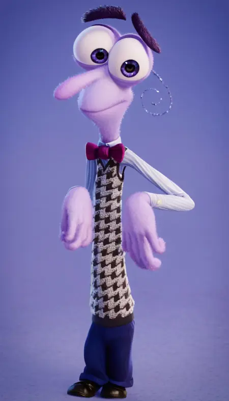 I ran a prompting test: "fearinsideout" alone is not enough to get accurate appearance. His floating eyebrows, long nose and slim body seem to work without being prompted for. If you don't describe his clothes as they are in canon and his eye colour they WILL change. If you don't specify his skin colour it may change as well. I also got random ears with the shorter experimental prompt.
