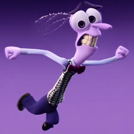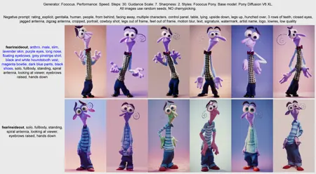 Aside from the trigger word I used these captions to describe the character: "anthro, male, slim, lavender skin, purple eyes, long nose, floating eyebrows, antenna, grey pinstripe shirt, black and white houndstooth vest, magenta bowtie, dark blue pants, black shoes". His antenna changes shape, and even when it's spiral (most common shape) the direction is inconsistent, so I have low expectations with it.