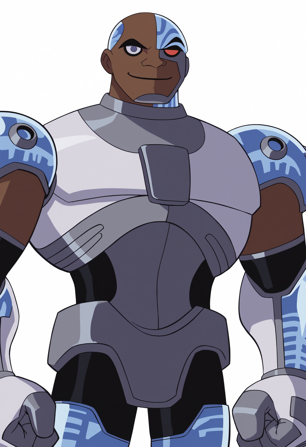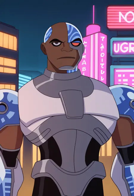 サイボーグ:victorcyborg, 1boy, dark skin, armor, bald, gloves, red eyes, black eyes