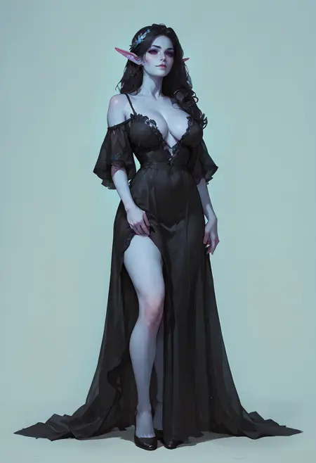 1girl, breasts, large breasts, colored sclera, purple sclera, pointy ears, colored skin, blue skin, black hair, dress