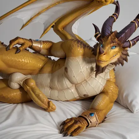 추가 프롬프트: dragon, yellow scales, wings, horns, tail, tail end, claws, male, 1boy, blue sclera, black pupils, chest fins