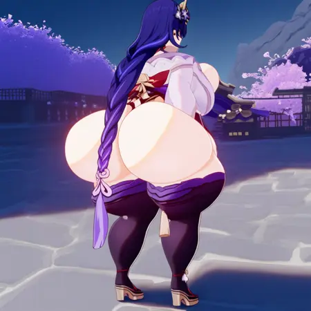raiden shogun, long hair, braided ponytail, purple eyes, purple hair, hair ornaments, gigantic breast, gigantic ass, Curvaceous body