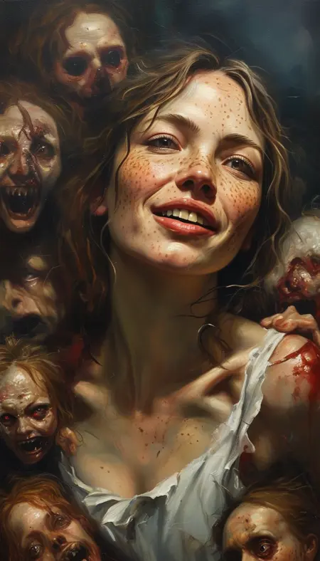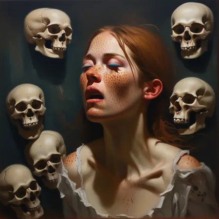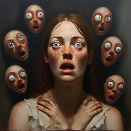 악몽의 인물이 신비로움과 익명성을 더한다. 이 인물은 흰 옷의 가장자리를 잡아당기고 있으며, 가슴 부분이 찢어진 듯 보인다. 중심 인물 주변에는 어두운 배경에 여러 개의 사실적인 눈이 그려져 있어, 모든 방향에서 감시당하는 강렬한 느낌을 준다. 이 그림에서 눈의 사용은 감시와 관찰의 느낌을 불러일으키며, 가려진 얼굴은 정체성과 은폐라는 주제를 암시한다. 또는 공포감.
