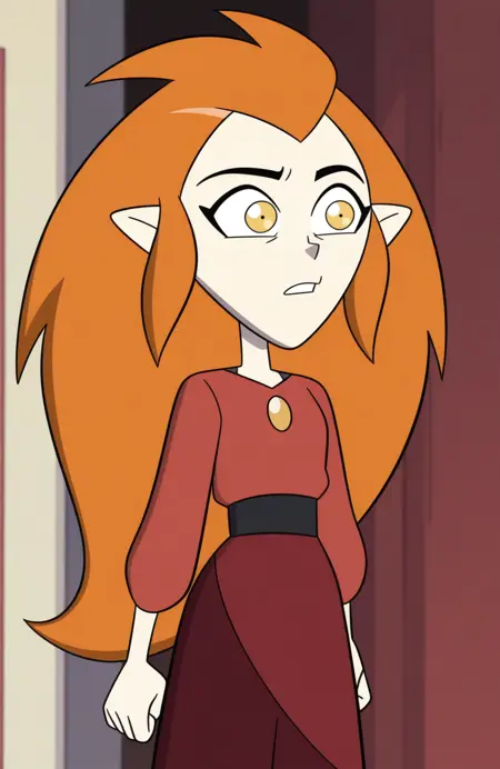 Eda Clawthorne: eda clawthorne, pointy ears, big hair, very long hair, grey hair, yellow eyes / heterochromia, grey eyes, yellow eyes, lipstick, fang, gold fang, mature female