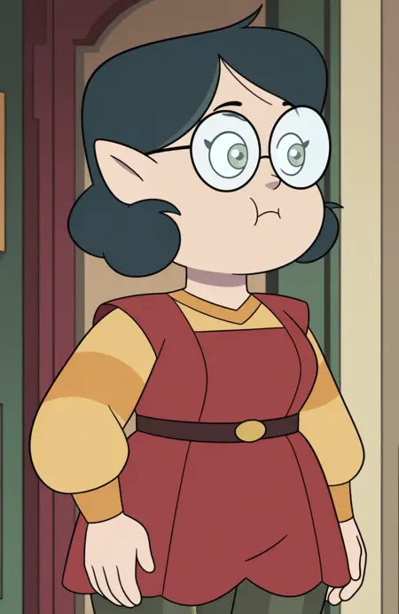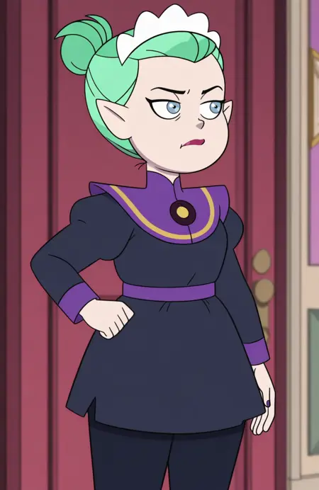Odalia Blight: odalia blight, pointy ears, blue eyes, green hair, hair slicked back, hair bun, plump, mature female
